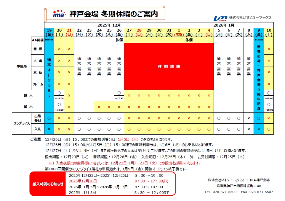 平素は格別のお引き立てをいただき厚くお礼申し上げます。 神戸会場では、誠に勝手ながら下記日程を冬期休暇といたします。